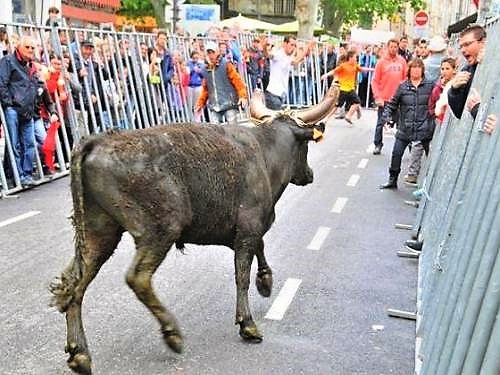 Feria pasquale = tjurrusningen fram till arenan. Gatorna är avstängda och de för Camargue typiska tjurarna släpps lös på gatorna på väg till arenan. Festen markerar också inledningen på tjurfäktningssäsongen. Tjurfäktning i Provence är inte som vi först tänker oss. Tjuren dödas inte.