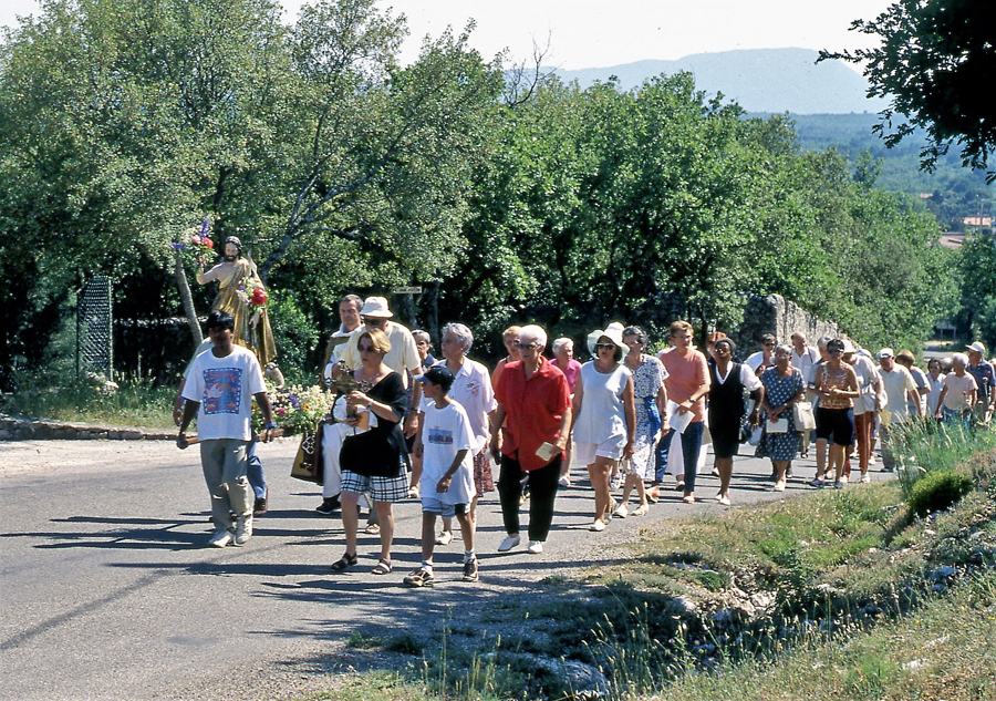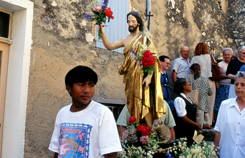 På landsbygden finns ofta ett litet kapell eller kyrka en bit utanför byn särskilt helgad åt St Jean. På förmiddagen samlas folk utanför bykyrkan. Man tar ut Johannesstatyn - ofta snidad i trä - och i procession drar man sedan vidare med Johannes i en bärstol. Bärarna får avlösa varandra för statyn är tung-. Det är en bra bit man ska gå och det stiger brant uppför. Det är extra påfrestande i middagshettan och många ha varit förståndiga att ha ett paraply med, som skänker lite tacksam skugga. Uppe på höjden ligger Chapelle St Jean från 1600-talet och det är här som mässan ska förrättas. Kapellet är blomstersmyckat både vid porten och inuti i kapellet.